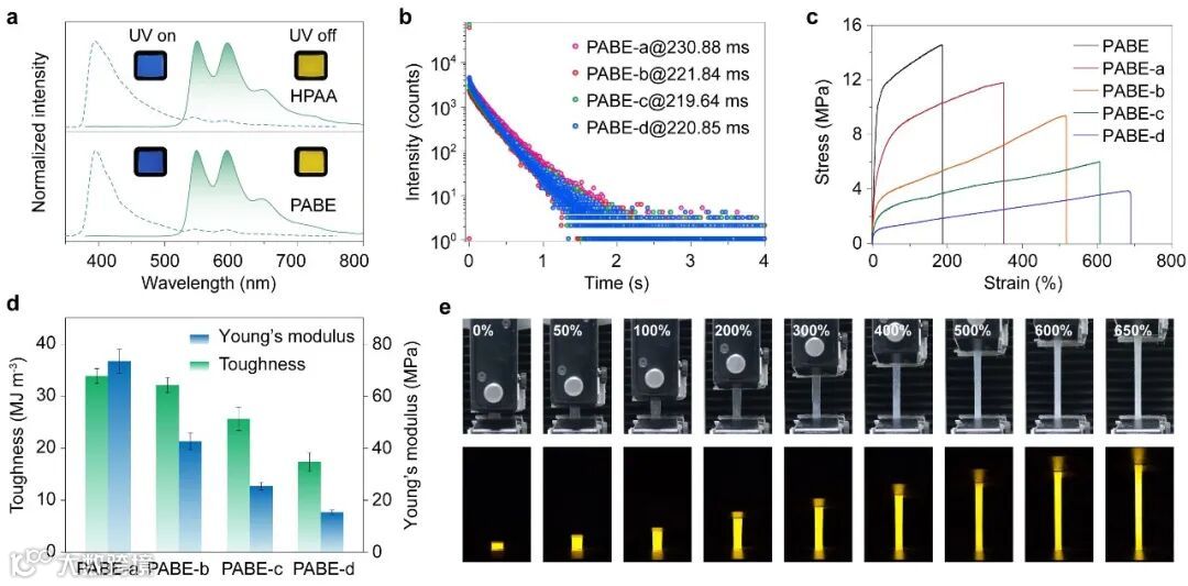 该研究团队选择溴代异丁酸酯修饰的萘酰亚胺(DBI)作为ATRP引发剂以及磷光发色团,通过第一步ATRP将丙烯酸叔丁酯共价连接到DBI单元上,再以不同链长的甲基丙烯酸烷基酯作为柔性单体进行ATRP扩链,并将经过两步ATRP所制备的共聚物经水解,得到系列聚丙烯酸-co-聚甲基丙烯酸酯嵌段共聚物。不同柔性嵌段的聚合物均展现出超长室温磷光发射(图2a)以及可调的拉伸性能。其中,基于甲基丙烯酸丁酯(BMA)制备的共聚物PABE表现出最高的拉伸性,因此,研究人员通过增加BMA柔性单体的投料比例,进一步制备了具有不同分子量的共聚物PABE-a、PABE-b、PABE-c和PABE-d。如图2b所示,随着聚合物分子量的增加,PABEs系列聚合物的光物理性质几乎没有变化,磷光发射峰稳定在548 nm,并且磷光寿命保持在220 ms以上。然而,柔性链段质量分数的增加对聚合物的力学性能有显著影响,其断裂伸长率从188%显著提高到690%(图2c)。随着聚丙烯酸嵌段相对含量的降低,共聚物的韧性逐渐从33.8 MJ/m3降低到17.4 MJ/m3,杨氏模量也从112.8 MPa降低到15.4 MPa(图2d)。以上实验结果表明,聚甲基丙烯酸丁酯(PBMA)嵌段含量的增加可以提供更有效的应变能耗散,从而提高共聚物的变形能力,而聚丙烯酸硬段不仅为发色团提供刚性微环境促进室温磷光的产生,而且可作为物理交联点调节共聚物的力学强度。此外,PABE-d聚合物在不同的应力应变条件下均能保持明亮且均匀的黄色长余辉发光,表明共聚物具有优异的机械和光学稳定性(图2e)。