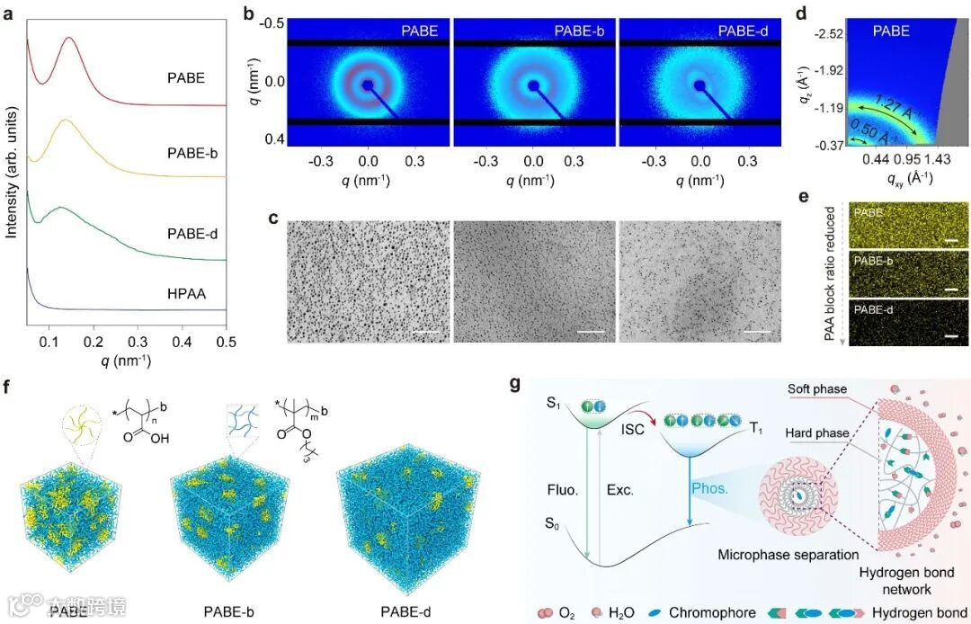为了探究聚合物兼具高拉伸性和超长磷光的原因,进一步对聚合物的微观形貌进行了一系列测试表征。如图3a和b所示,PABE、PABE-b和PABE-d的SAXS谱图显示出明显的单宽散射峰,表明嵌段共聚物中形成了多重微相结构。随着PBMA含量的增加,SAXS散射峰逐渐向低q区移动,表明筹间距在逐渐增加,并且散射峰的强度逐渐下降,表明多相体系中硬筹的相对含量在逐渐降低,符合力学测试中杨氏模量逐渐减小的趋势。同时,聚合物的TEM图像显示出清晰的两相形貌,更加直观地证明了微相分离结构的形成(图3c)。其中,聚丙烯酸硬相均匀分散在连续的PBMA软相中。同时,随着聚合物链段中AA/BMA的摩尔比从1/1变化到1/9,TEM图像中的软筹(灰色区域)逐渐增多,且筹间距逐渐增大,这一结果与SAXS散射峰的变化趋势一致,而这种变化可能是导致不同分子量的PABEs薄膜拉伸性能不同的原因。此外,研究人员对不同分子量的PABEs共聚物进行了大尺寸粗粒度分子动力学模拟。如图3f所示,经过1.2×106 τ的模拟,得到不同两亲性嵌段共聚物在体相中的硬-软微相分离结构,该理论模拟结果与SAXS和TEM测试结果较好吻合。基于以上探究,研究人员提出,在软-硬多级微相的协同作用下,最终可以获得兼具超长磷光、高拉伸性以及优异稳定性的嵌段共聚物(图3g)。