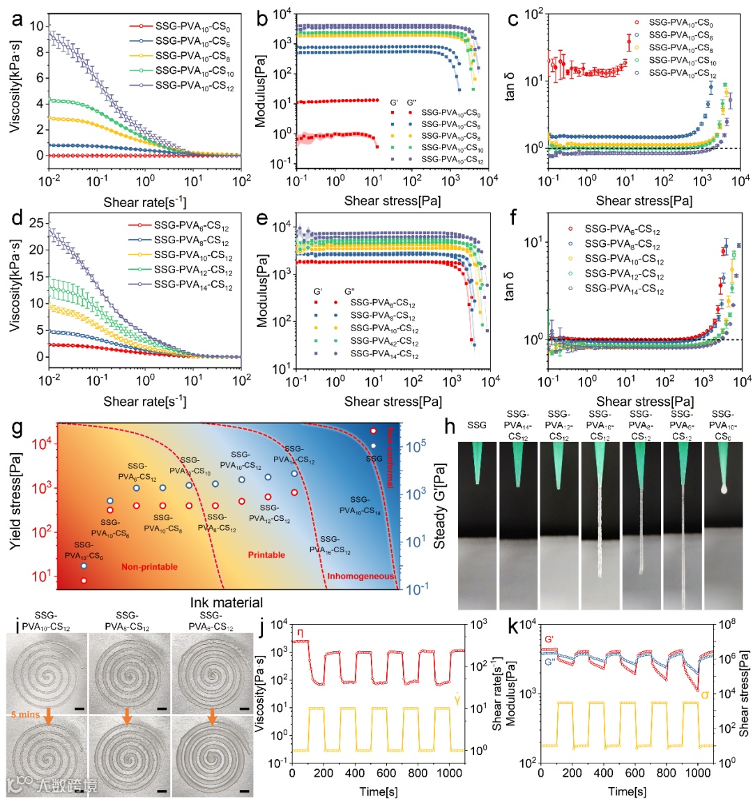 作者系统研究了组分配比对剪切变硬复合材料前驱体(墨水)流变性能的影响(图2),用以优化3D打印工艺。首先,对比分析了不同壳聚糖含量墨水的流变性能。不同壳聚糖含量的墨水均表现出剪切变稀行为,壳聚糖含量的增加通过增强分子间作用力而提高了体系粘度。此外,壳聚糖的含量增加也促进了墨水从类流体向类固体状态的转变。壳聚糖含量对墨水流变行为的影响主要是由于壳聚糖颗粒的刚性,及其与剪切变硬胶和聚乙烯醇之间的氢键和范德华力相互作用对分子链滑移和运动的阻碍作用。然后,探讨了聚乙烯醇含量对墨水流变性能的调控规律。不同聚乙烯醇含量的墨水具有类似的剪切变稀性能,且聚乙烯醇含量的增加对粘度提升有促进作用,随着聚乙烯醇含量的增加,体系的储能模量、损耗模量与屈服应力均随之增加,表现出增强的类固体特征。进一步地,通过挤出沉积形貌观测,实现了配比优化。