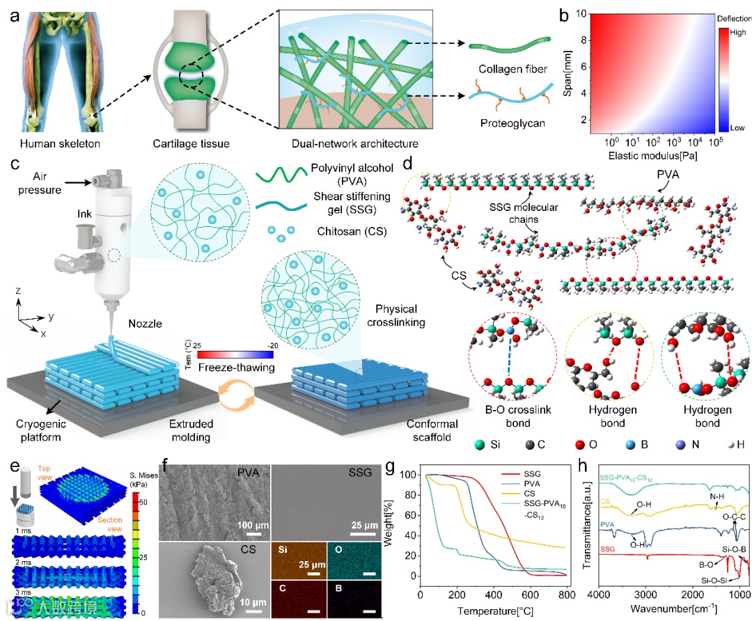 剪切变硬复合材料是采用高温聚合、溶液共混和机械球磨的工艺制备得到,随后通过定制的气动挤压3轴沉积系统通过低温辅助的直接墨水书写(Direct ink writing,DIW)技术逐层沉积实现结构设计(图1)。首先,通过冻融方法使得PVA发生结晶交联,形成物理交联体系,作为稳定网络保证复合材料的完整性。同时,剪切变硬胶的B原子和O原子可形成动态交联体系,作为次级网络调控复合材料的力学性能。此外,三者存在丰富的极性官能团,有助于分子内和分子间氢键的形成,保证良好的界面相互作用,在经受力学载荷时也能够发生破坏而耗散部分能量。