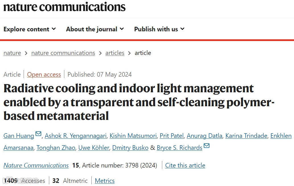 随着全球气候变化加剧和自然资源日益枯竭,发展可持续建筑已成为全球范围内亟待解决的紧迫问题。这不仅涉及到节能减排的环境需求,也关系到经济和社会发展的可持续性。卡尔斯鲁厄理工学院(KIT)黄干和Bryce Richards团队近期研发的一种聚合物基微光子多功能超材料(PMMM),为现代建筑提供了一种新的解决方案,这种材料集环保、能效和功能性于一身,为推动未来建筑向可持续发展演进提供了方法。这项研究成果“Radiative cooling and indoor light management enabled by a transparent and self-cleaning polymer-based metamaterial”发表于《自然·通讯》期刊。