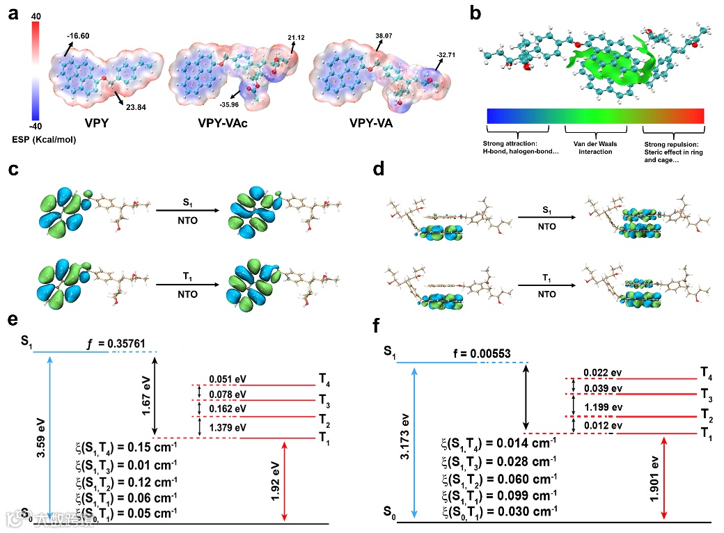 作者为了进一步研究具有高效RTP性能的聚合物的潜在机理,计算了VPY、VAc-VPY、VA-VPY和VA-VPY二聚体模型单元的激发态特性,包括NTO、能级和SOC常数。与VPY相比,VPY-VAc和VPY-VA的负ESP分别集中在酯基和羟基上,它们分散在碳链的氢原子和芳环之间(图5a)。VA-VPY(70.78 Kcal/mol)的静电势差比VAc-VPY(57.08 Kcal/mol)和VPY(40.44 Kcal/mol)更强,反映了分子链之间的相互作用更强。结果表明,与聚合物PVAc-PVPY相比,聚合物PVA-PVPY具有更强的刚性。然后,作者通过Multiwfn采用IGMH分析来直观地研究VA-VPY二聚体内的分子间相互作用。如图5b所示,可以看出IGMH图很好地揭示了二聚体之间的实际主要相互作用区域。两个芘基团之间等值面上的绿色表明该区域的电子密度非常低,这意味着相互作用完全以范德华色散为主。对于单体VA-VPY的S1态和T1态,它们的NTOs反映出电子主要分布在芘上。绝对轨道与以π-π*跃迁为主的激发态重叠,表现出典型的局部激发(LE)特性,这使得从S1到T1的转变变得困难,并导致SOC值较小。对于二聚体VA-VPY,NTOs在两个芘单元上都表现出明显的电荷转移(CT),表明芘单元的π电子在域外,导致激发态能降低和红移发射(图5e和5f)。如图5e和图5f所示,与单体VPY相比,VA-VPY单体和二聚体的最低单重态和最低三重态(ΔEST)之间的能级差从1.674 eV降低到1.272 eV,SOC常数比单体VPY高约10倍。这些数据表明,分子间的弱相互作用实现了激子的一级约束,氢键在先前相互作用的基础上实现了二级约束,显著压缩了聚合物非辐射途径,富集了三重态激子的垂直激发能,从而提高了RTP。