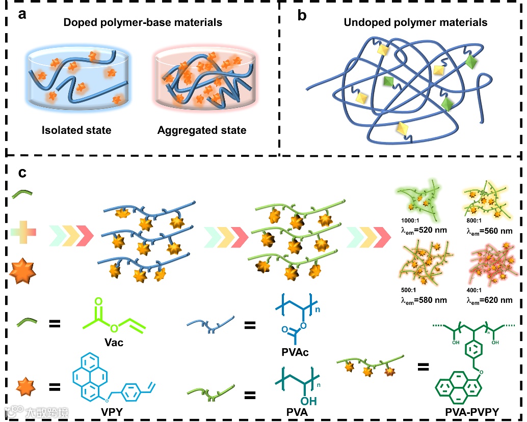 为此,重庆理工大学杨朝龙教授团队通过Williamson成醚反应制备了新型磷光体VPY。然后,将磷光体VPY与醋酸乙烯酯(VAc)共聚,比例为400:1、500:1、600:1、800:1和1000:1,样品分别命名为PVAc-PVPY-400、PVAc-PVPY-500、PVAc-PVPY-600、PVAc-PVPY-800、PVAc-PVAc-PVPY-1000。令人惊讶的是,不同比例的共聚物在大气环境下表现出具有激发和时间依赖特性的多色RTP。此外,通过醇解制备了一系列PVA衍生物(命名为PVA-PVPY-400、PVA-PVPY-500、PVA-PVPY-600、PVA-PVPY-800、PVA-PVPY-1000)。醇解过程提供了大量的羟基来构建氢键网络,以增强体系的刚性结构,并进一步提高磷光性能。因此,作者通过仅包含一个磷光单元的本征聚合物实现了多色RTP。此外,作者还通过对不同浓度下聚合物和单体的光物理性质、结构表征和分子模拟的比较分析,阐明了实现多色RTP的聚集和分离状态机制。