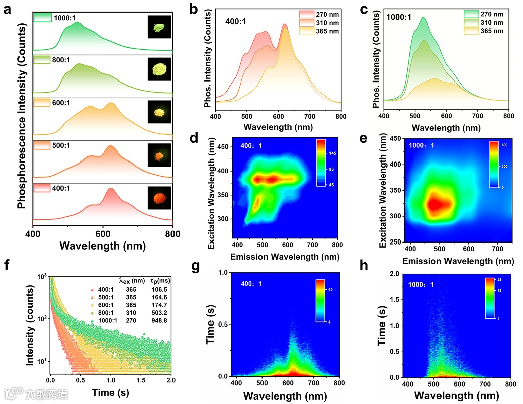 在关闭365 nm紫外灯后,作者观察到不同比例的PVA-PVPY聚合物在大气环境下的余辉颜色有显著差异。当激发波长从270 nm变为365 nm时,聚合物的主要发射中心显示出明显的红移(从520 nm到620 nm),并伴有发光颜色从绿色变为红色(图2a)。PVA-PVPY在其最高发射峰下的磷光寿命也发生了变化。最短和最长寿命分别为106.5 ms (PVA-PVPY-400)和948.8 ms (PVA-PVPY-1000)(图2f)。令人惊讶的是,所有PVA-PVPY聚合物都表现出明显的激发依赖性。例如,随着激发波长从270 nm增加到365 nm,PVA-PVPY-400的绿色范围相对强度降低,而红色范围强度保持不变。(图2b)。其他比例的聚合物PVA-PVPY-500、PVA-PVPY-600和PVA-PVPY-800具有类似的效果。有趣的是,这些长寿命RTP聚合物的余辉性能在关闭紫外光后表现出明显的时间依赖性(图3a)。以PVA-PVPY-400为例,关闭紫外灯后,余辉颜色在4 s内逐渐由红色变为微弱的绿色余辉。磷光光谱也证实了聚合物PVA-PVPY-400的余辉颜色表现出时间依赖性(图3e)。PVA-PVPY-400在620 nm、560 nm和520 nm处的发射寿命分别为434.4 ms、173.7 ms和106.5 ms,表明主要磷光发射中心位于620 nm处(图3d)。然而,PVA-PVPY-1000表现出相反的余辉颜色现象(图3f),PVA-PVPY-1000在620 nm、560 nm和520 nm处的发射寿命分别为178.7 ms、270.4 ms和948.8 ms,这表明主要磷光发射中心位于520 nm处(图3g和图3h)。同样,这些随时间变化的余辉现象也存在于其他三种聚合物中。众所周知,根据Kasha定律,激子通常从最低的三重态(T1)辐射跃迁返回基态(S0)。然而,PVA-PVPY聚合物在365 nm激发后表现出不同的余辉颜色,表明它可能具有几种不同的T1能级。换句话说,这些结果表明PVA-PVPY聚合物可能具有不同的发射中心,仅取决于一种磷光单元(图3b)。