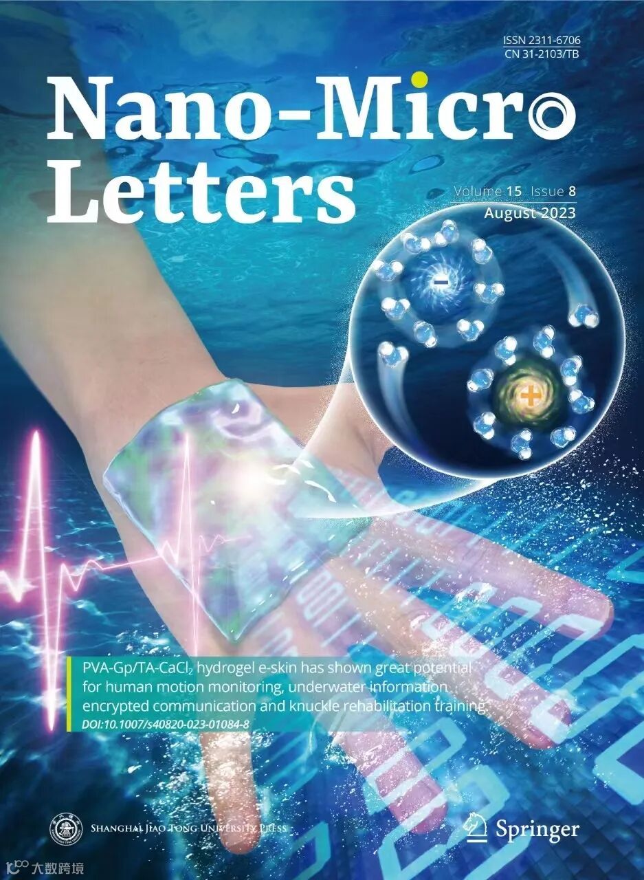 3.田野团队采用全新的制备工艺开发了一种受皮肤启发的超强韧电子皮肤,其具有可调的机械性能、优异的导电性、抗菌性和紫外线防护等多种特性。该电子皮肤不仅可以监测人体日常生理活动,而且还可以用于复杂的水下活动监测和信息加密/解密。另外,基于该电子皮肤还创建了一套完整的手指关节康复训练系统,该系统具有交互式界面,可以动态呈现用户的健康状况。该多功能超强韧电子皮肤将对未来的新型康复医学、人机交互、VR/AR和元宇宙等领域具有重要意义。该成果以“Skin-inspired ultra-tough supramolecular multifunctional hydrogel electronic skin for human-machine interaction”为题发表在Nano-Micro Letters期刊上,并被选为封面文章,入选ESI高被引论文,硕士生陈坤为第一作者,田野副教授为通讯作者。