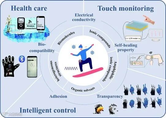 6.田野团队根据抑制冰结晶和抑制冰成核的防冻机理对防冻水凝胶柔性传感器进行了系统分类和总结,详细阐述了防冻水凝胶传感中具有代表性的防冻剂以及相应的制备方法。同时,详细介绍了防冻水凝胶传感器的主要性质。此外,还重点介绍了防冻水凝胶传感器在可穿戴人机交互中的代表性应用,包括医疗保健、触摸监控和智能控制。最后,概述了该领域目前面临的关键挑战以及对未来趋势的展望。该工作以“Anti-freeze Hydrogel-based Sensors for Intelligent Wearable Human-Machine Interaction”为题发表在Chemical Engineering Journal 期刊上,硕士生付志伟为第一作者,田野副教授为通讯作者。