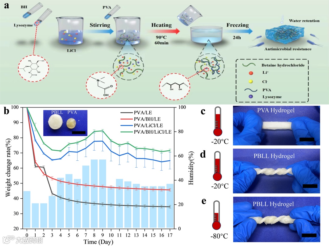 7.田野团队制备了一种湿度自适应水凝胶传感器PBLL。此水凝胶传感器具有良好的防冻性能、高导电性、高灵敏度、抑菌性、生物相容性及保水性能。本研究将PBLL水凝胶传感器与无线传输和物联网技术协同集成,实现了运动分析和康复评估的人机交互系统,能为用户提供实时数据和交互式体验。PBLL水凝胶传感器在医疗康复、物联网、人工智能等领域显示出巨大的应用潜力。该成果以“Humidity Adaptive Antifreeze Hydrogel Sensor for Intelligent Control and Human-Computer Interaction”为题发表在Small期刊上,博士生刘若楠为第一作者,田野副教授为通讯作者。