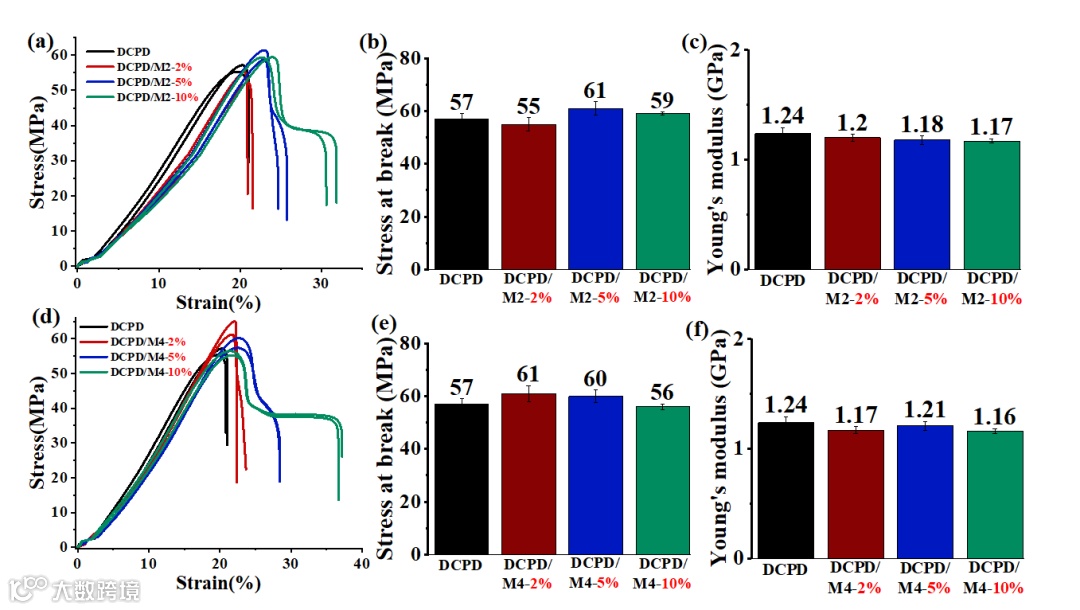 最后,作者进行了材料的降解闭环回收性能的研究,使用环辛烯与二烯烃单体M2共聚所制备的聚合物材料通过降解得到的官能团封端聚烯烃,这些降解产物继续通过相应的缩聚反应可转化回可降解聚合物,重制后的热塑材料力学性能稍有减弱;同时,由于降解所得的线性PDCPD聚合物含有大量未反应的环戊烯单元,其可继续参与DCPD的复分解交联反应用以合成新的PDCPD热固材料,添加不同含量回收的线性PDCPD聚合物使得新制备的PDCPD热固材料的拉伸性能仍有很好的维持,从而使得聚合物材料实现闭环回收(图5)。