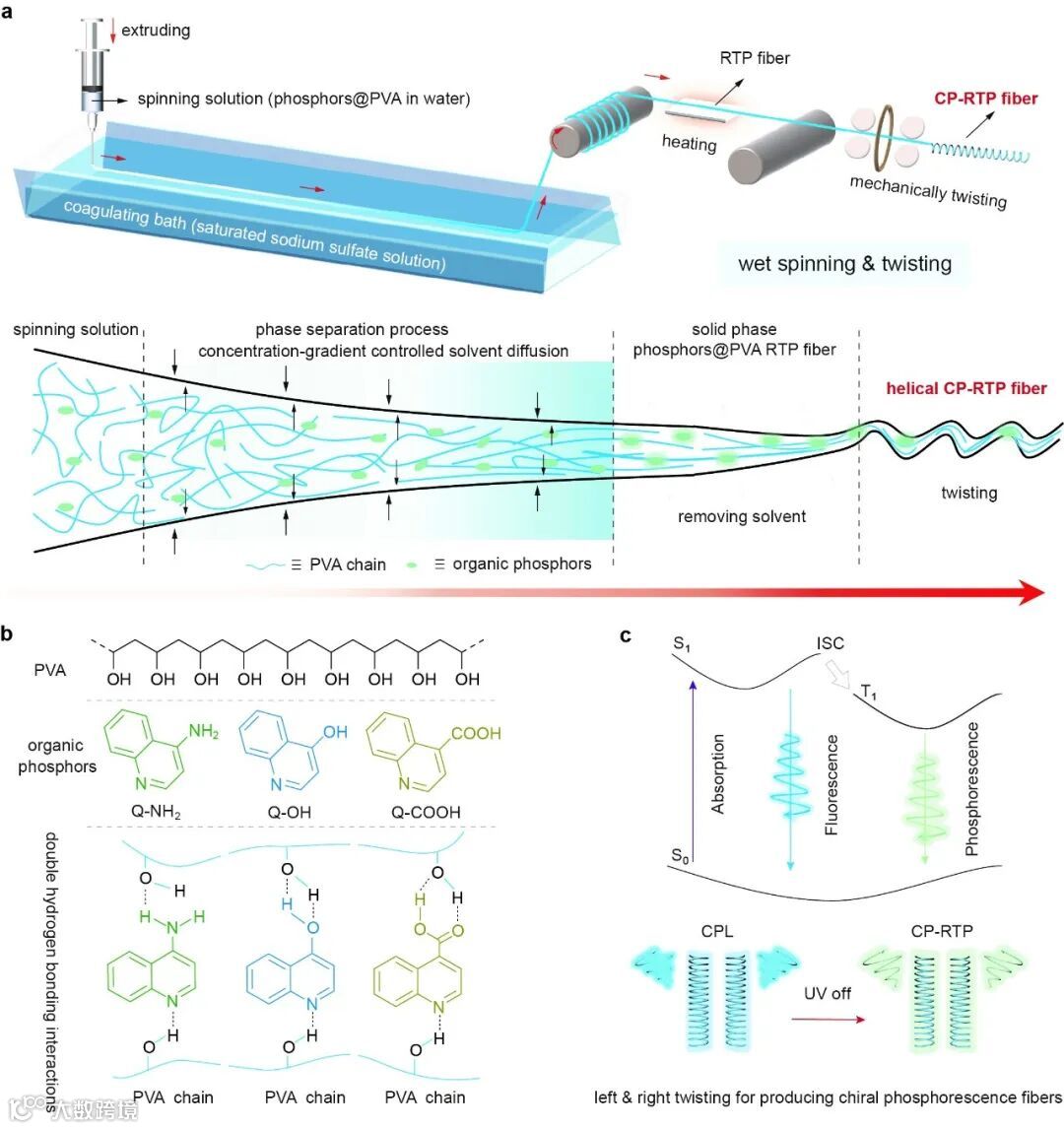 图1 (a)结合湿法纺丝和加捻技术制备CP-RTP纤维的示意图;(b)PVA和三种喹啉衍生物的化学结构以及形成双重氢键相互作用。(c)CP-RTP纤维的基本机理