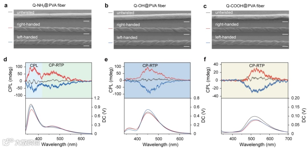 近日,东华大学纤维材料改性国家重点实验室&材料科学与工程学院朱美芳院士、成艳华研究员、张新海副研究员等,提出了一种湿法纺丝和加捻技术相结合的方法,连续生成了新一代RTP纤维,在单一系统中可以同时实现室温磷光、手性、鲁棒性、柔韧性和可编织性的集成(图1)。该纤维选择商业维纶的重要工业原料聚乙烯醇(PVA)作为聚合物基质,分别负载三组带有氨基、羟基和羧基基团的廉价喹啉衍生物,从而生成三种类型的PVA基纤维,得益于PVA分子链与喹啉衍生物之间的氢键相互作用,与纯PVA纤维相比,这三种PVA基纤维显示出更强的强度。此外,由于特定吡啶单元产生大量三重激子的有效系间窜越过程和PVA网络中受限的分子运动相互配合,产生了长效室温磷光。且螺旋状微结构促使PVA基室温磷光纤维转变为圆偏振室温磷光纤维,为设计手性磷光材料开辟了新的途径。