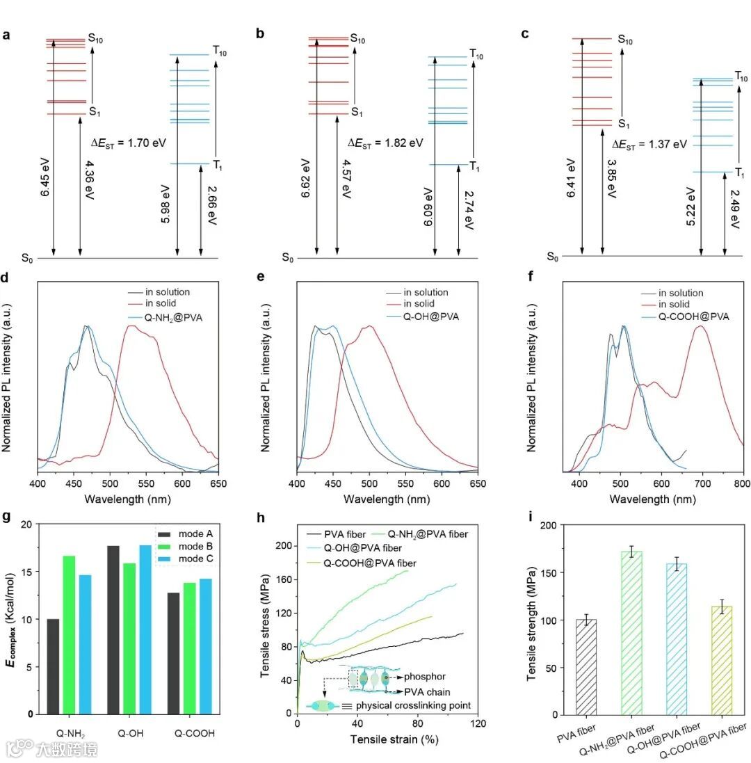 进一步研究表明(图3),Q-NH2、Q-OH和Q-COOH都具备低温磷光发射特性;而实验及模拟计算的结果进一步表明PVA不仅提供和低温类似的刚性微环境,且PVA分子链与喹啉衍生物之间存在的氢键非共价相互作用对室温磷光发射至关重要,协同效应在增强系间窜越过程和抑制分子运动方面发挥了重要作用,最终实现室温磷光;三组PVA基纤维的拉伸强度的提升(最高1.7倍于纯PVA纤维)再次佐证了氢键非共价相互作用的存在。
