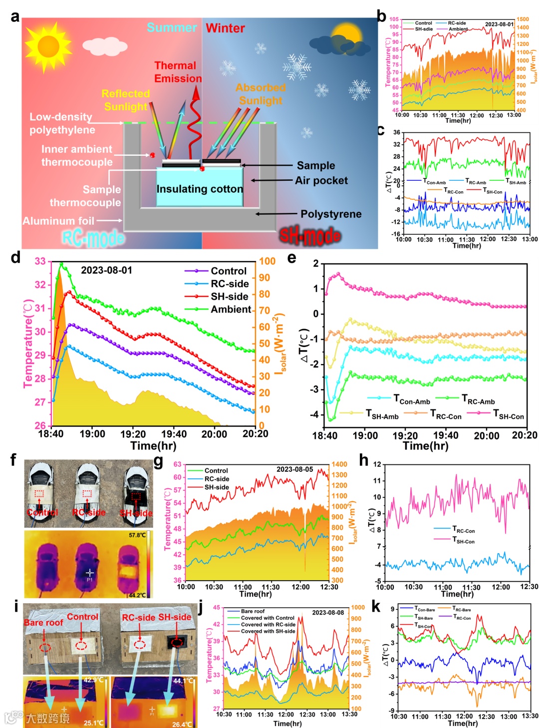 图5 SHRC-skin在亚环境及户外实际应用中的热管理性能