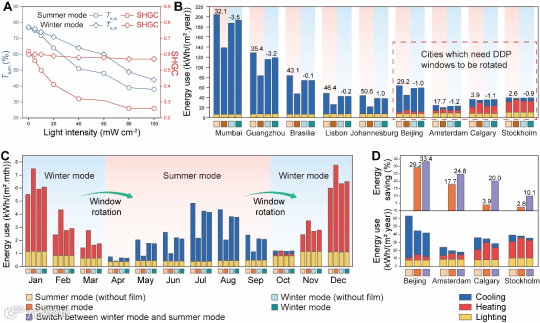 图 5. 模拟 DDP 窗的节能性能。(A)在不同光照强度下,DDP窗户在冬季和夏季模式下的Tlum和SHGC变化。(B)安装了DDP窗的模型办公室在不同城市的年能耗计算结果。条形图上标注了DDP窗户在夏季和冬季模式下与不使用Fe-W-PC膜的情况相比的节能百分比。(C)卡尔加里使用DDP窗的办公室模型的每月能耗计算。(D)北京、阿姆斯特丹、卡尔加里和斯德哥尔摩装有DDP窗的办公室模型在连续夏季模式和切换模式下的年能耗和节能计算。