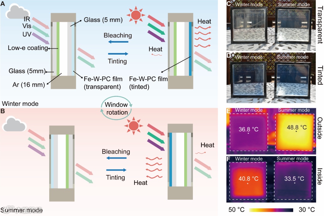 图 2. 双模式双层光致变色(DDP)智能窗在(A)冬季模式和(B)夏季模式下的设计和工作原理。(C)透明状态和(D)着色状态下的照片(右图)。在冬季模式和夏季模式下,窗户在阳光下的(E)外表面和(F)内表面的红外照片。
