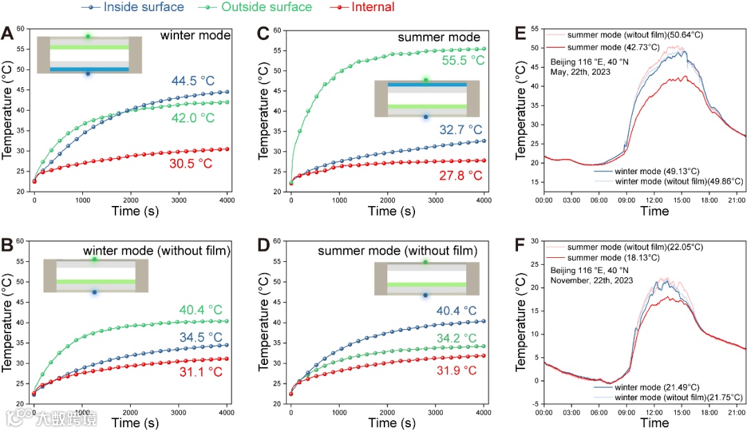 图 3. DDP智能窗对室内温度的影响。(A-D)在模拟太阳光照射4000秒的情况下,(A)冬季模式、(B)不带Fe-W-PC膜的冬季模式、(C)夏季模式和(D)不带Fe-W-PC膜的夏季模式下,装有DDP窗的样板房的温度曲线;(E)在夏季和(F)冬季晴天的实地测试中,装有DDP窗户的样板房的温度曲线。