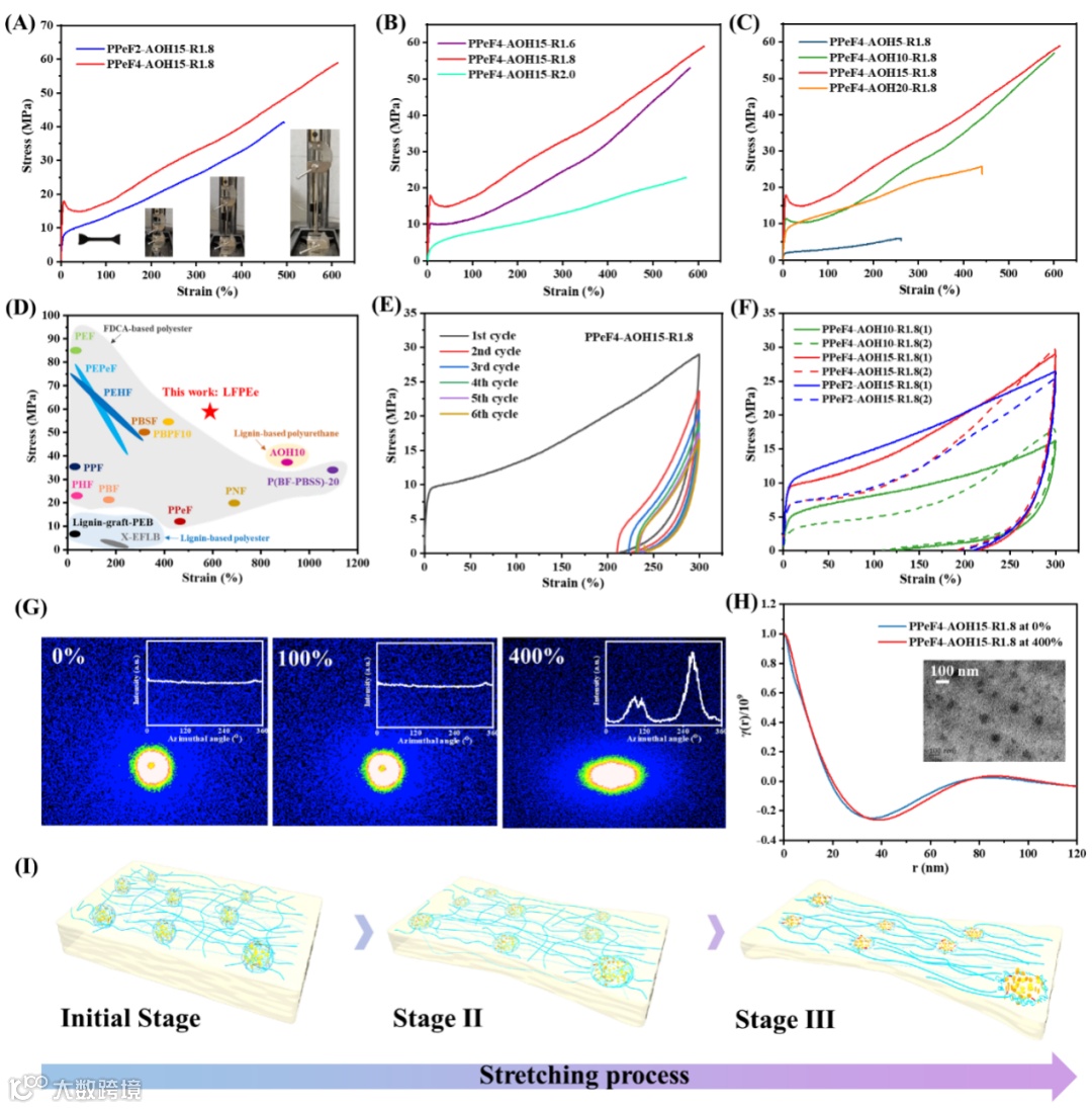 LFPEe表现出优异的力学性能,拉伸强度和断裂应变可达到58.9 MPa和610%,弹性恢复率达到88.9%以上,杨氏模量达到332 MPa,远高于商用聚酯弹性体、聚氨酯弹性体和聚烯烃弹性体,优于大多数先前报道的FDCA基聚酯,木质素基聚酯和木质素基聚氨酯弹性体材料。其优异力学性能归因于:木质素在聚酯体系中不相容形成的纳米微相分离结构,以及木质素与聚酯链段之间形成的界面动态氢键和动态共价键组成的动态双网络结构。