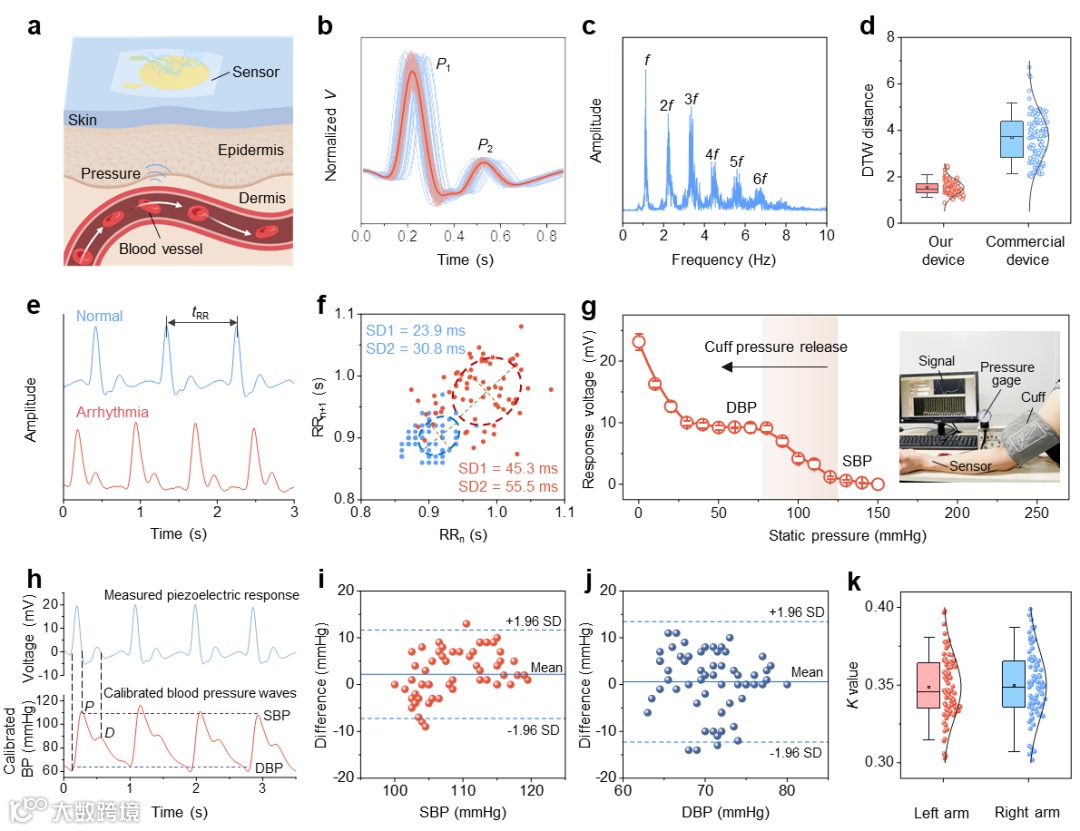 图3. 心率及血压信号的监测和分析 (a-c) 压电复合器件对桡动脉的监测及稳定性分析;(e-f) 正常及心率失常患者的监测数据及Poincare图分析;(g-h) 改进的袖带法用于传感器血压监测标定;(i-j) 压电复合材料器件和商业器件监测血压的Bland-Altman图用于评估监测精度;(k) 左臂和右臂桡动脉血压信号形状因子的统计结果。