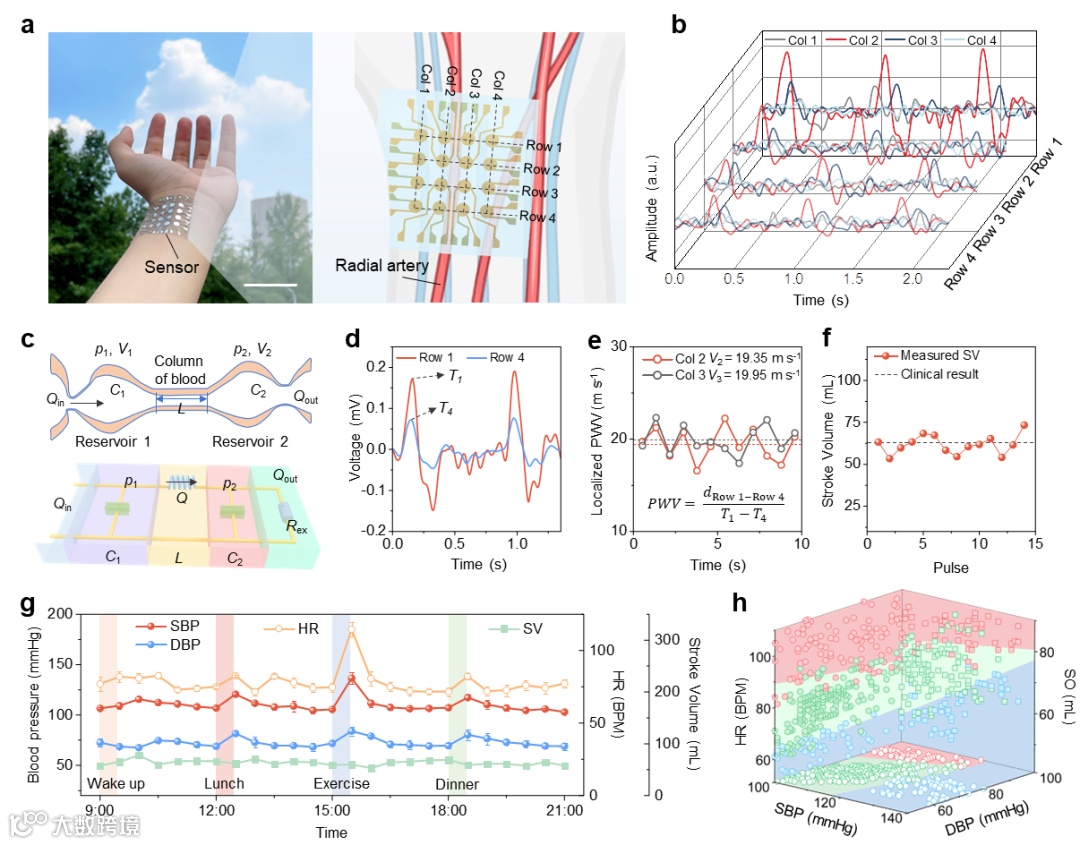 图4. 压电传感阵列器件用于全天血流动力学监测 (a) 压电复合材料柔性传感阵列用于桡动脉监测实物图及示意图;(b) 阵列中不同传感单元的压电信号响应;(c) 心血管循环系统的物理模型及等效电路示意图;(d-f) 桡动脉局域脉冲波速、每搏输出量的分析;(g) 志愿者全天不同生理活动下的血流动力学参数监测结果;(h) 基于机器学习的心血管生理参数分类。