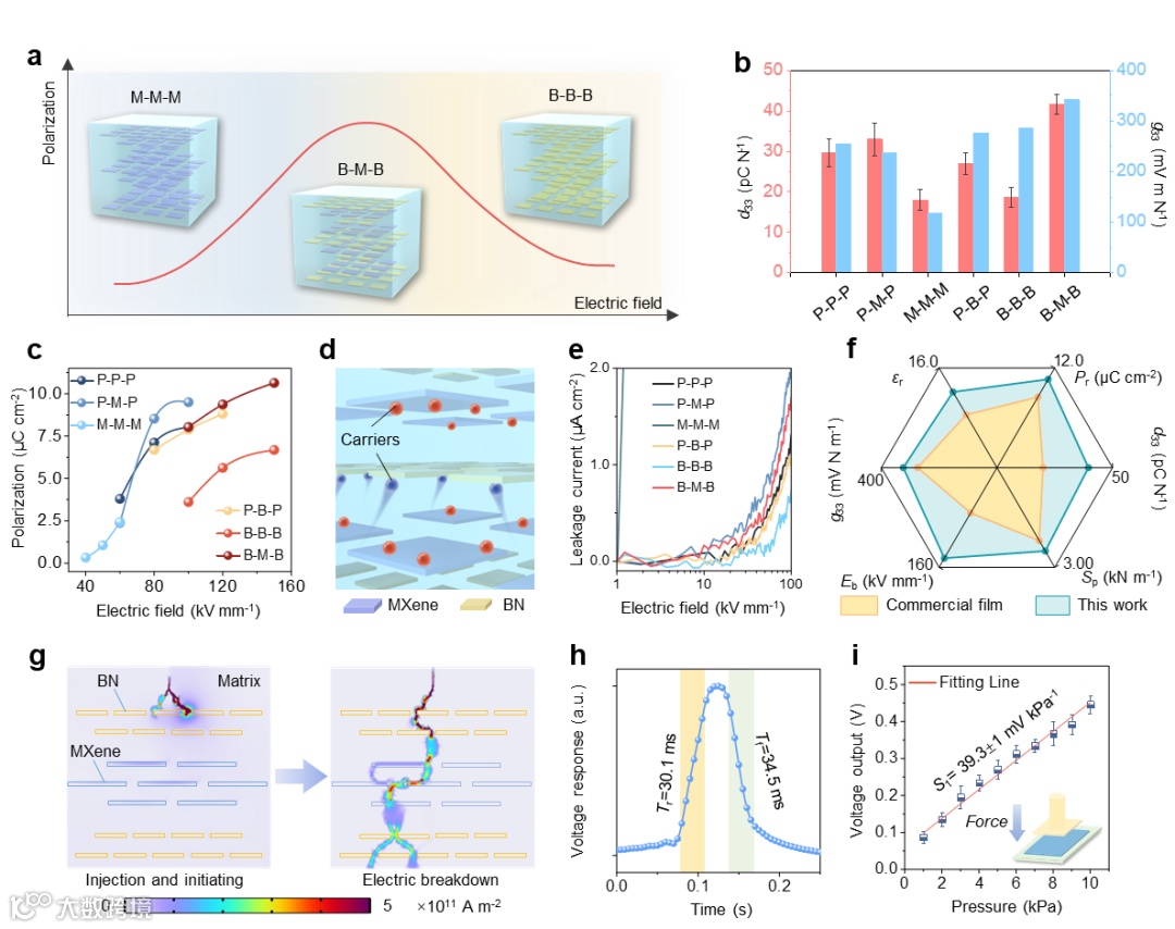 图2. 层次化结构压电复合材料压电增强机理探索及器件性能表征 (a) 不同层状异质结构极化性能示意图;(b-c) 不同复合结构的压电电荷系数、压电电压常数及极化强度;(d-e) BN纳米片对材料内部漏电流的抑制机制示意图及不同复合结构的漏电流曲线;(f) 复合薄膜与商业PVDF压电膜性能对比雷达图;(g)复合材料内部电流路径模拟结果;(h-i) 压电复合器件的响应时间及压力响应灵敏度。