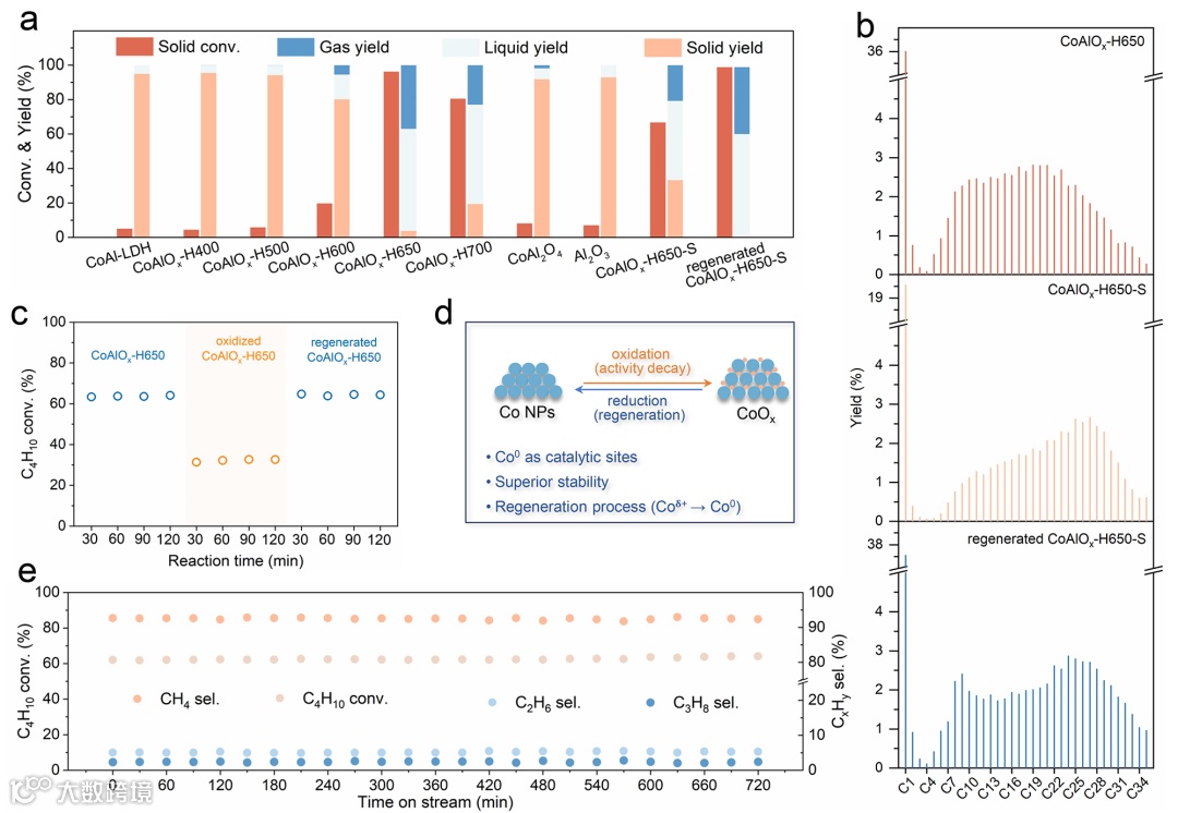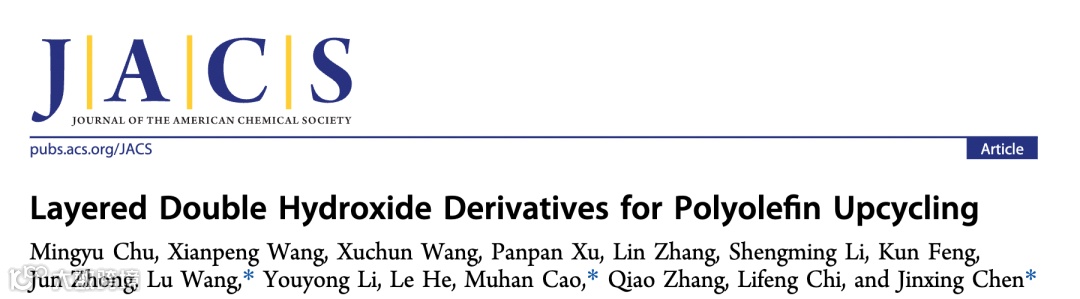 近期,苏州大学功能纳米与软物质研究院的陈金星副教授与曹暮寒副研究员和王璐教授合作,发展了聚烯烃氢解的高效非贵金属催化剂。该团队通过将钴基层状双氢氧化物(CoAl-LDH)进行不同条件的还原处理,实现了钴物种结构的连续演化,由CoAl-LDH转变为Co-Al混合氧化物和Co/CoAlOx(图1)。实验结果表明,金属Co物种(Co/CoAlOx中的Co0位点)展现出最高的聚烯烃氢解活性。在280°C、2 MPa H2压力以及3小时的反应条件下,性能最优的CoAlOx-H650展现出96.2%的LDPE固体转化率(图2)。机制研究表明,聚烯烃分子易于金属Co表面发生C-C键的连续裂解,生成大量低附加值的甲烷气体。为解决这一挑战,该团队利用LDH材料的组分灵活性,通过向前驱体组分中掺杂痕量加氢金属Ni实现了对氢解选择性的显著优化。该工作以“Layered Double Hydroxide Derivatives for Polyolefin Upcycling”为题发表在《J. Am. Chem. Soc》上,该文的第一作者是苏州大学博士生褚名宇,通讯作者为苏州大学陈金星副教授、曹暮寒副研究员和王璐教授。该工作得到了国家自然科学项目的资助。