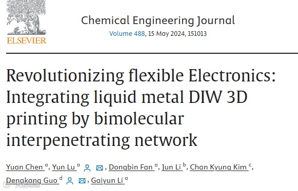 Yuan Chen, Yun Lu*, Dongbin Fan, Jun Li, Chan Kyung Kim, Dengkang Guo*, Gaiyun Li. Revolutionizing flexible electronics: integrating liquid metal DIW 3D printing by bimolecular interpenetrating network. Chemical Engineering Journal, 2024, 488, 151013.