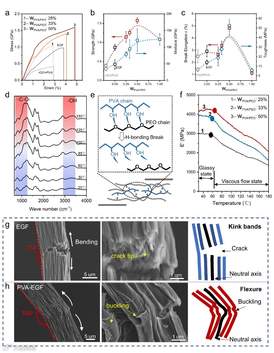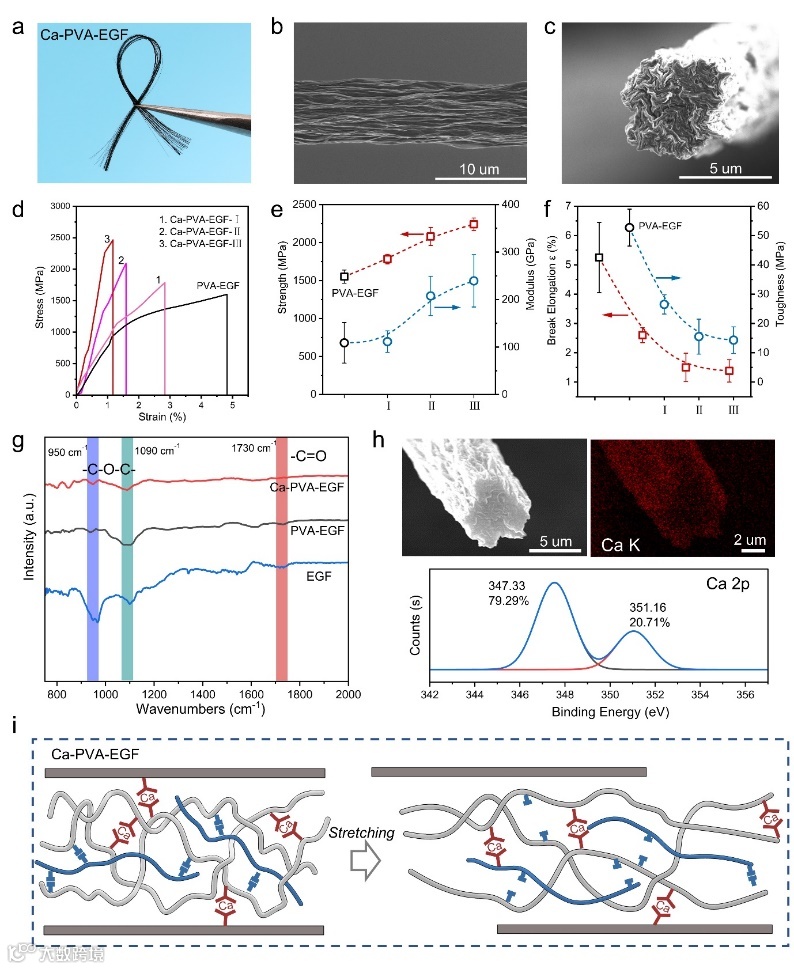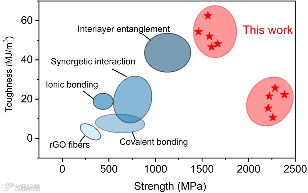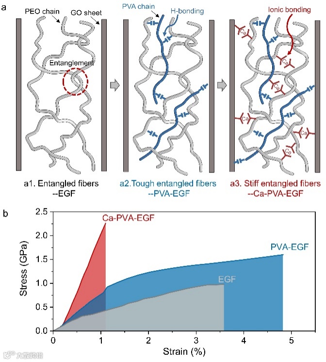 天然生物材料具有的优异机械性能源于其从分子到宏观组织构架中复杂的层次结构,以及在基本结构功能单元之间丰富多彩的界面设计。在天然贝壳珍珠层中,同时存在氢键、共价键和离子键,它们协同发挥作用共同增强贝壳机械性能。在珍珠层的“砖-泥”结构中,作为“软泥”主要成分之一的大分子蛋白质,具有特殊的折叠多肽链,分子链之间含有大量动态氢键,当存在层间剪切作用时,多肽链展开,同时伴随有氢键的断裂和重组,以消除应力集中,阻碍裂纹扩展。除了氢键,Ca2+在分子之间形成金属配位键,增强了层间粘结力和剪切强度。人造仿生材料除了对自然生物结构的模仿,复刻其复杂多重的层间/界面相互作用成为提升仿生材料机械性能另一个有效的途径,特别是人造仿贝壳材料。在前期工作中,层间缠结已经被证明可以作为一种新的增韧机制去制备仿贝壳类复合材料。那么在单一的物理缠结基础上,设计更加复杂的界面缠结能否进一步打破现有复合材料的性能极限,值得被深入探索研究。