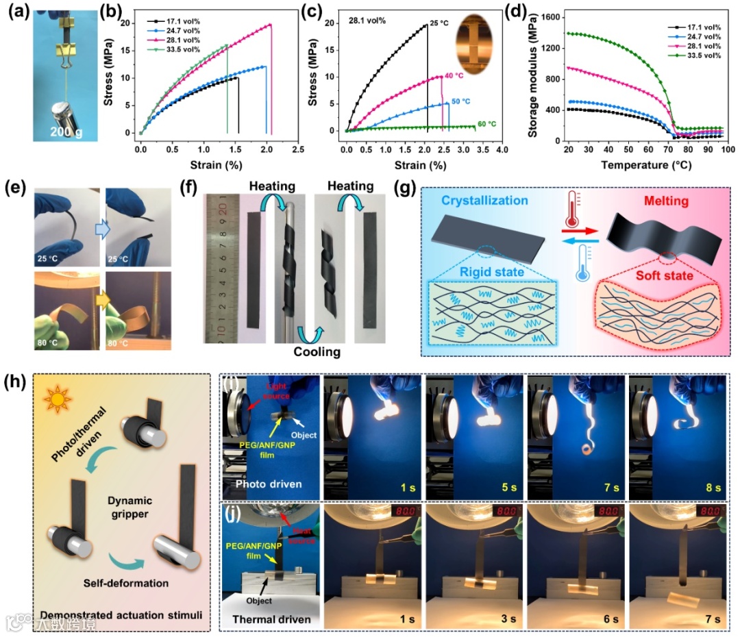 图6. (a)PEG/ANF/GNP薄膜提起200 g的砝码。(b)不同GNP含量的薄膜在25 ℃和(c)28.1 vol%薄膜在不同温度下的应力-应变曲线,插图为实际测试中的照片。(d)PEG/ANF/GNP薄膜的储能模量随温度的变化。(e)PEG/ANF/GNP薄膜在25 ℃和80 ℃下的热致柔性照片。(f)PEG/ANF/GNP薄膜热致形状记忆行为的照片。(g)PEG内部聚合物链在结晶和熔融状态下的微观结构演变的示意图。基于相变薄膜的动态夹持器:(h)工作原理图,(i)光驱动和(j)热驱动的变形行为。