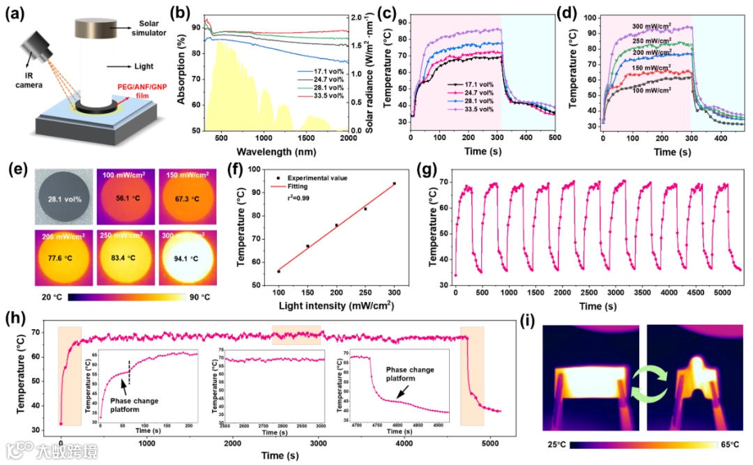 图5. (a)模拟太阳光辐射的PEG/ANF/GNP薄膜工作示意图。(b)PEG/ANF/GNP膜的UV-vis吸收光谱,(c)200 mW/cm2光功率密度下的温度-时间响应曲线。(d)28.1 vol% PEG/ANF/GNP薄膜在不同光功率密度下的表面温度变化和(e)相应的红外热像图。(f)饱和稳态温度与辐照功率密度的实验数据和线性拟合曲线。(g)循环开关和(h)功率密度为150 mW/cm2长期光照时28.1 vol% PEG/ANF/GNP薄膜的表面温度变化。(i)光照射的PEG/ANF/GNP薄膜循环弯曲的红外热像图。