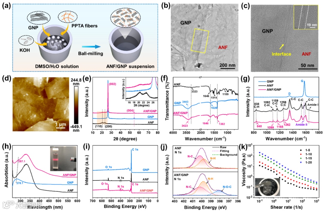 图1. (a)ANF/GNP分散液的球磨制备示意图。ANF/GNP的(b)TEM,(c)HR-TEM,(d)AFM图。GNP,ANF,ANF/GNP的(e)XRD图,(f)FTIR光谱,(g)拉曼光谱,(h)UV-vis吸收光谱,(i)XPS谱图。(j)ANF和ANF/GNP的N 1s的XPS高分辨谱图。(k)不同GNP含量的ANF/GNP稳态剪切粘度,插图为ANF/GNP分散液的照片。