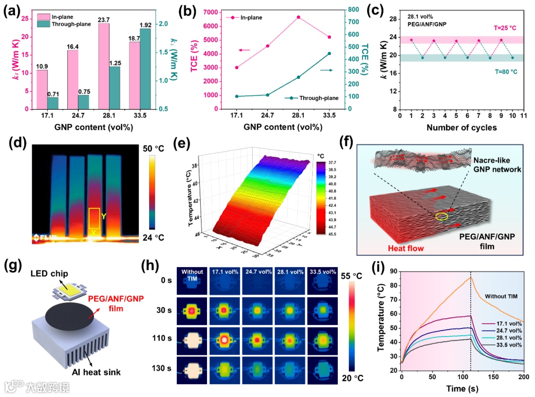 图4. PEG/ANF/GNP层状膜的导热性能。(a)PEG/ANF/GNP薄膜的面内(λ∥)和垂直方向(λ⊥)导热系数和(b)热增长量。(c)循环加热/冷却过程中薄膜的面内导热系数。(d, e)从左到右依次为17.1, 24.7, 28.1, 33.5 vol% GNP含量的PEG/ANF/GNP薄膜的红外热像图。(f)热传导机理图。PEG/ANF/GNP层状薄膜作为TIMs的(g)示意图,(h)红外热像图和(i)相应的温度变化曲线。