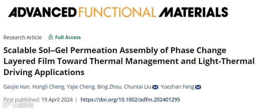 该工作以题为“Scalable Sol-Gel Permeation Assembly of Phase Change Layered Film Towards Thermal Management and Light-Thermal Driving Applications”发表在《Advanced Functional Materials》上。文章第一作者为郑州大学橡塑模具国家工程研究中心博士生韩高杰,通讯作者为郑州大学冯跃战副教授和刘春太教授。该研究得到了国家重点研发计划和国家自然科学基金的支持。