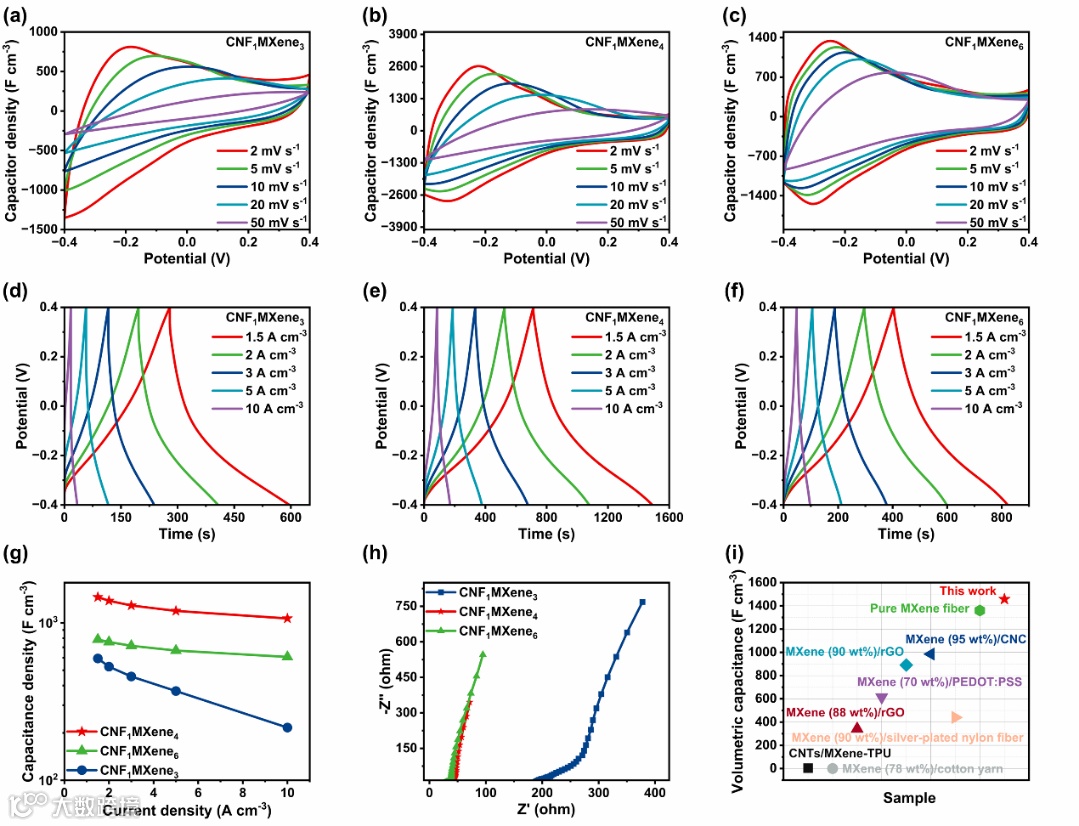 图3. CNF/MXene杂化纤维三电极电化学性能。