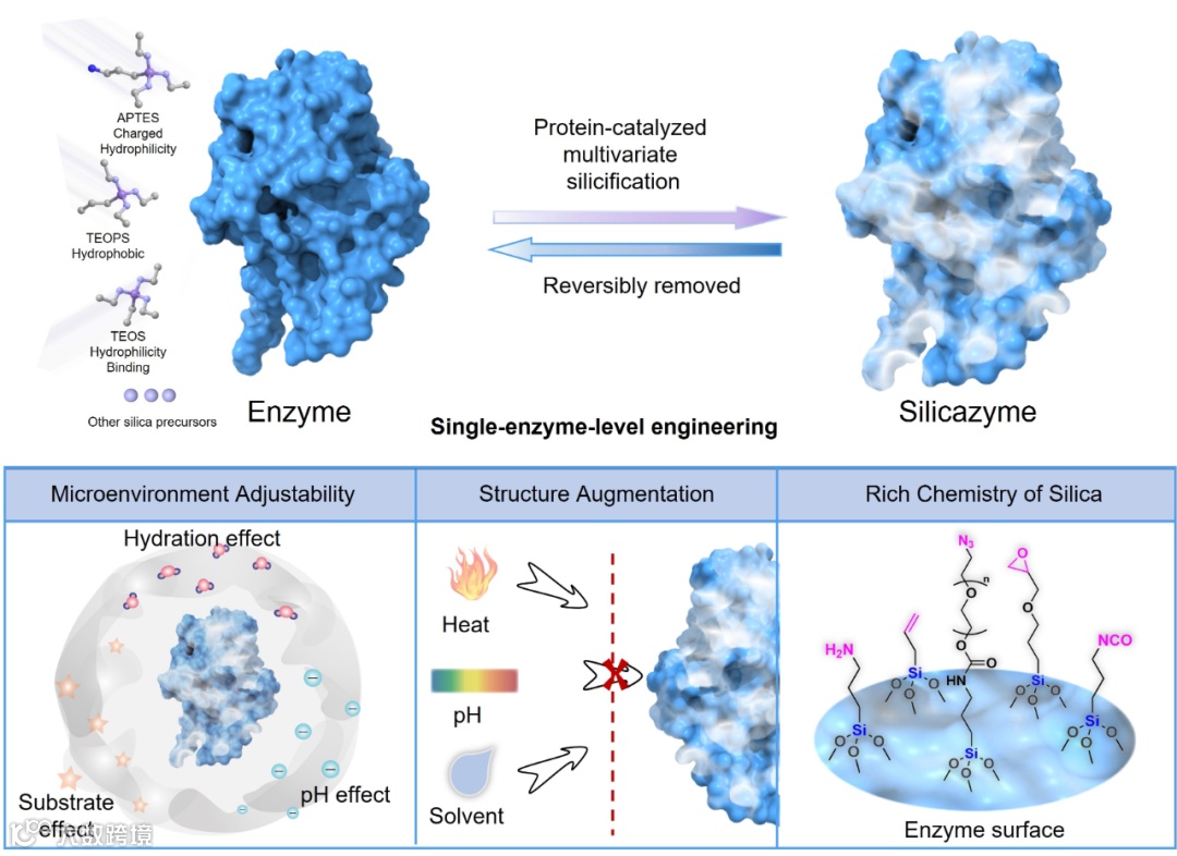 受溶胶-凝胶化学的启发,朱伟教授课题组提出一种新的杂化酶概念 - 硅酶 (silicazyme),其核心在于将具有不同化学性质的硅基前驱体与酶复合,进而在单酶尺度实现结构稳定性-酶活性的精确调控,实现单酶尺度下酶结构强化、活性调控、稳定性提升和功能扩展(图1)。