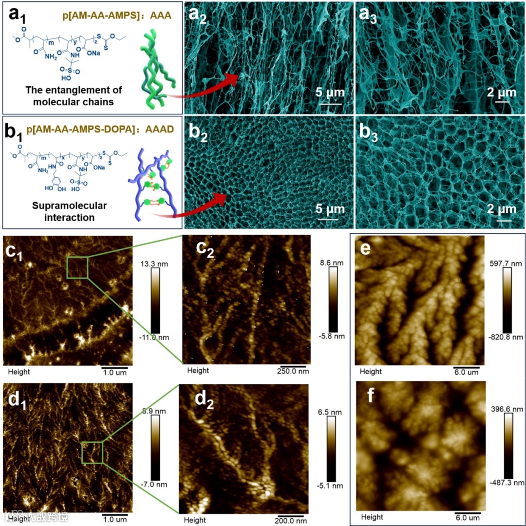 图2 (a1、b1)聚合物AAA和贻贝仿生超分子聚合物AAAD的网络结构示意图;不同放大倍数下聚合物AAA(a2、a3)和贻贝仿生超分子聚合物AAAD(b2、b3)的冷冻电镜图;不同放大倍数下0.01 %聚合物AAA(c1 , c2)和0.01 %贻贝仿生超分子聚合物AAAD(d1、d2)的原子力显微镜成像图;0.05 %聚合物AAA(e)和0.05 %贻贝仿生超分子聚合物AAAD(f)的原子力显微镜成像图。