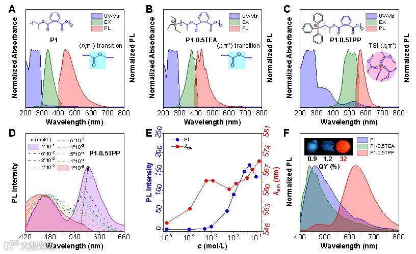 在这项工作中,如图1A和1B所示,无封端聚酯P1和胺封端聚酯P1-2.0TEA均有孤立酯基的n-π*跃迁吸收带(250~300 nm)和精细结构的n-π*发射峰(400~450 nm),且表现出了“紫外和激发不匹配”现象,350 nm的激发峰对应于酯基的n-π*跃迁,说明此两种聚合物的酯基基态n-π*跃迁较弱。如图1C所示,膦封端聚酯P1-0.5TPP出现了与激发带(380 nm)匹配的酯簇吸收带(300~450 nm),表明末端的TPP基团可能改变了P1的构象从而有利于增强酯基的基态n-π*跃迁。此外,P1-0.5TPP在450~600 nm处出现了另一个长波吸收带,并且与新的激发带(450~600 nm)很好地匹配,表明封端的TPP通过参与空间共轭形成了膦酯簇的新发光中心,并在DCM溶液中表现出570 nm的橙色簇发光。进一步,浓度依赖性的荧光谱图揭示了膦酯簇的形成过程,随着浓度增加,PL强度逐渐增强且发射峰从550 nm逐渐红移到570 nm(图1D和图1E)。固态PL光谱显示(图1F),P1和P1-0.5TEA仅显示弱蓝光,而P1-0.5TPP具有额外非常强的红色簇发光(610 nm),特别是其红光的QY高达32%,这是目前已报道的最高的红色簇发光效率。