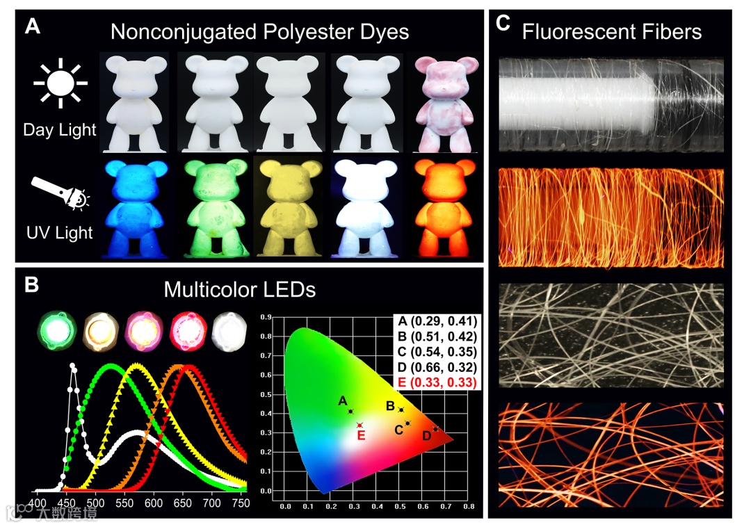 最后,该工作初步尝试了全色发光聚酯在荧光染料(图6A)、多色LEDs(图6B)、荧光纤维(图6C)等方面的应用,并构建了CIE色坐标(0.33,0.33),其接近日光的白光LED,其色温(CCT)为5560K,显色指数(CRI)高达80,可以满足一些应用要求。特别要指出的是,该工作表明簇发光聚酯材料在加工过程中(热压和拉伸)具有良好的发光稳定性,表明膦封端聚酯材料是一种性质稳定的荧光材料。