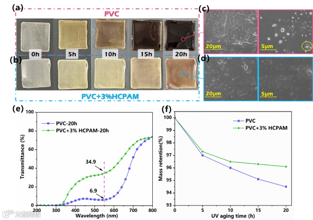 图 5. (a)-(b) 不同紫外老化时间下PVC 样品(厚度= 0.25 mm)表面照片,紫外老化20小时后PVC 样品表面的扫描电镜图像:纯 PVC(c)、PVC+3%HCPAM(d),紫外老化20小时后PVC样品的紫外可见光透射率(e)和质量保留率(f)