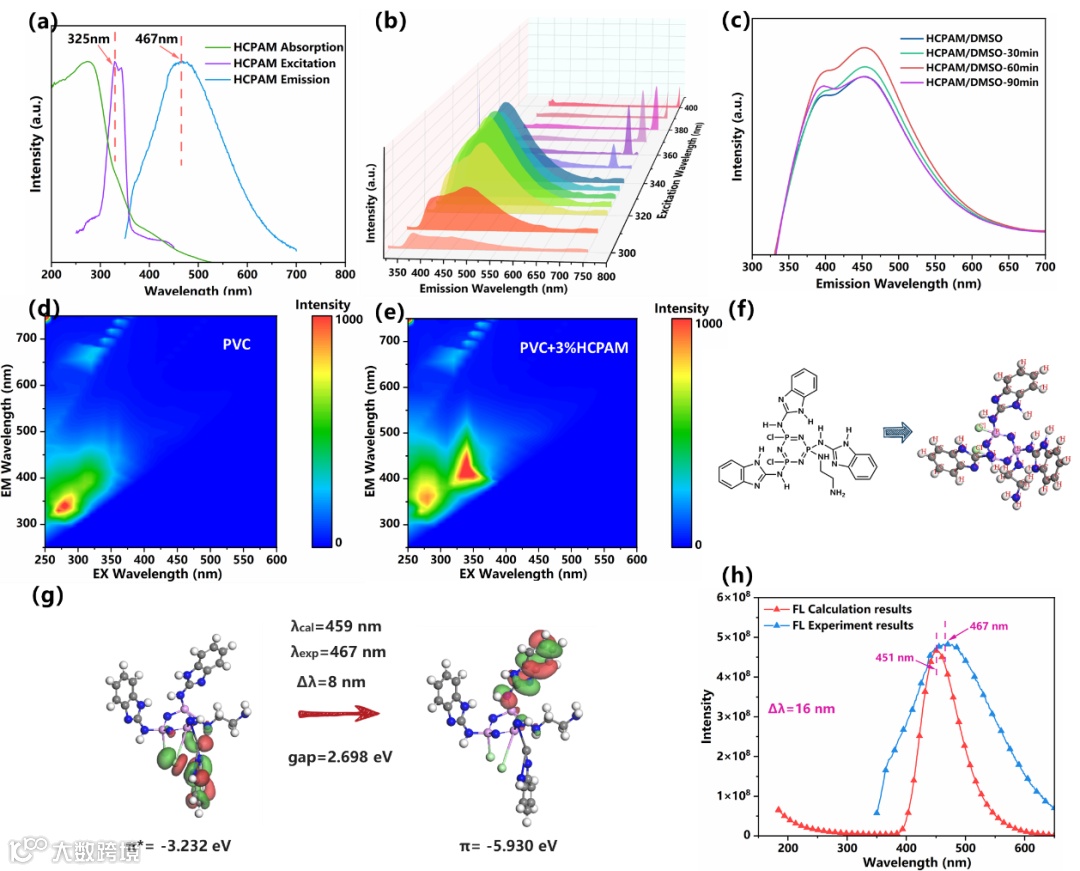 图3. (a) HCPAM的紫外-可见光吸收、荧光激发和发射光谱,(b) HCPAM溶液的荧光发射光谱(激发波长为300-400 nm),(c) HCPAM溶液在不同UV照射时间下的最优荧光发射光谱,PVDF(d) 和PVC+HCPAM复合材料(e)的EEM光谱,(f) HCPAM有效重复片段的优化结构,(g) HCPAM分子前线轨道的π*→π跃迁,(h) HCPAM荧光光谱的理论值和实验值