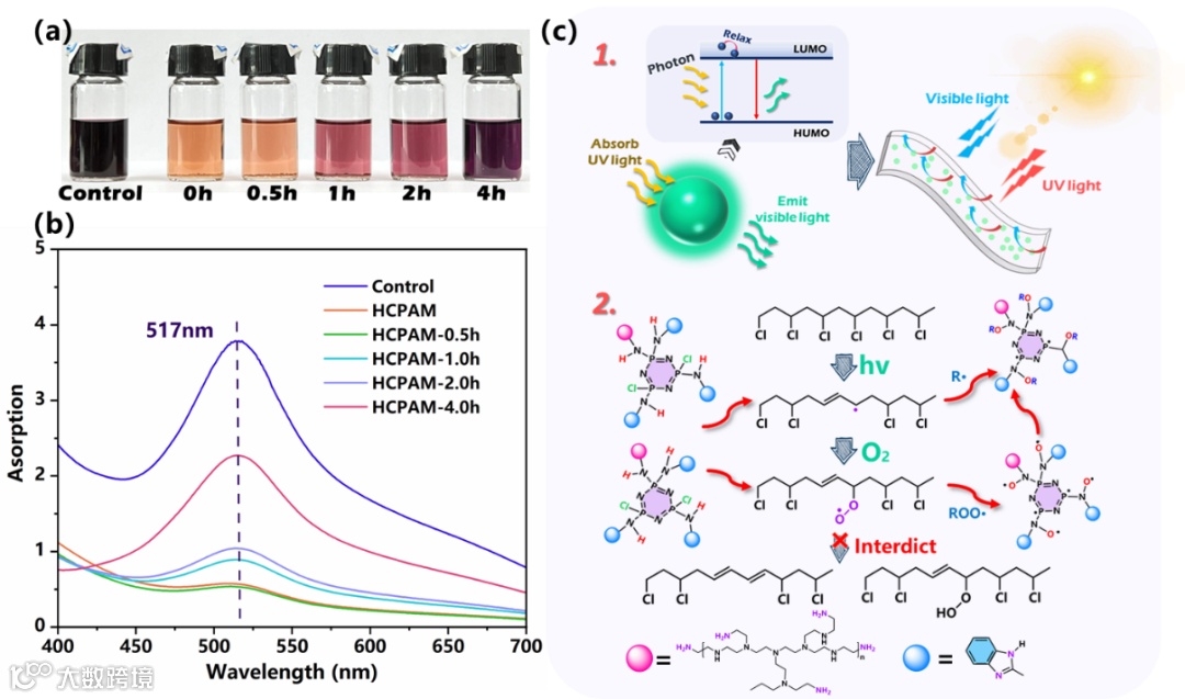 图 6. (a) DPPH和DPPH/HCPAM 溶液在不同紫外线照射时间下的颜色变化,(b) DPPH 混合溶液的紫外可见光吸收光谱,(c) PVC+HCPAM 复合材料的抗紫外线机理