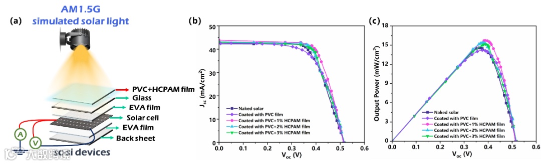 图 2. (a)负载PVC薄膜的sc-Si太阳能电池的光伏性能测试示意图,以及负载PVC+HCPAM层(厚度=20 μm)前后sc-Si 电池的 J-V 曲线(b)和发电功率(c)