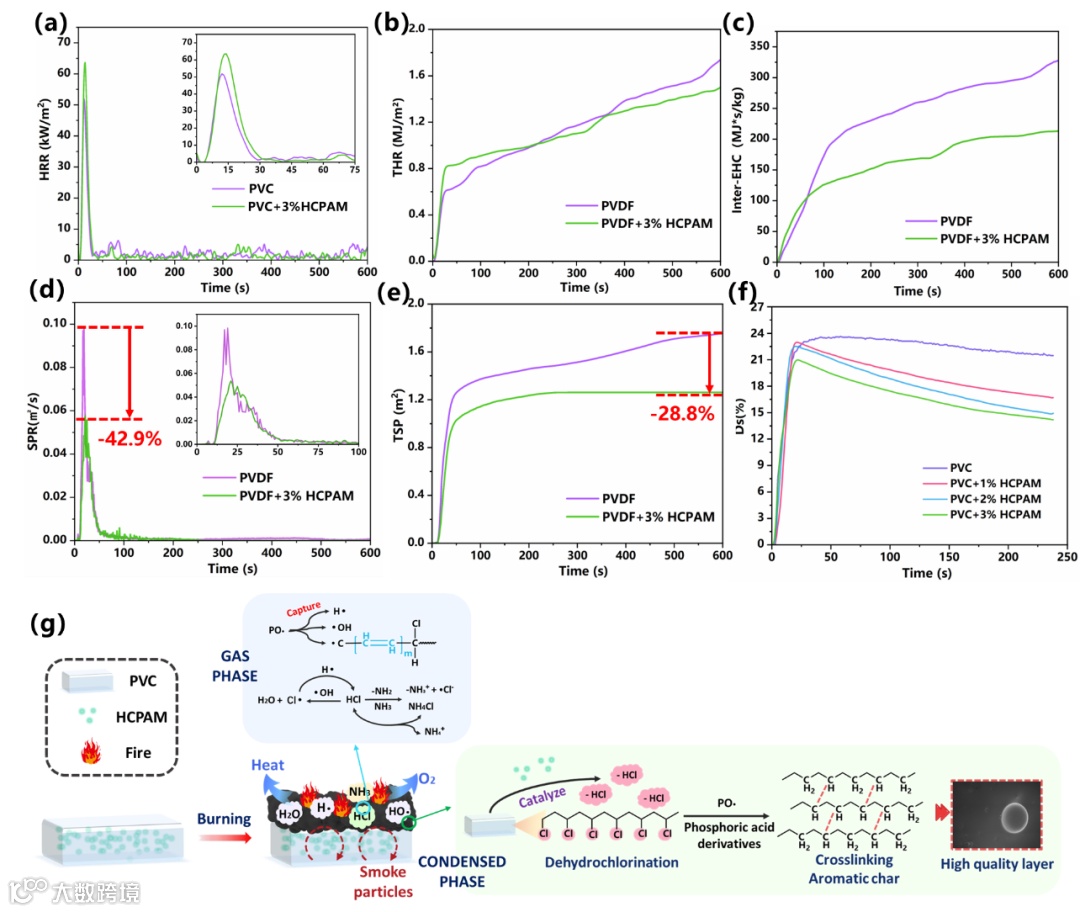 图 4. PVC 复合材料在热通量为35 kW/m2下的(a) 热释放速率(HRR)曲线,(b) 总热释放量(THR)曲线,(c) 有效燃烧热(EHC)曲线,(d) 烟生成速率(SPR)曲线,(e) 总烟生成量(TSP)曲线,(f) PVC和PVC+HCPAM复合薄膜的烟密度曲线,(g) PVC+HCPAM阻燃和抑烟机制示意图