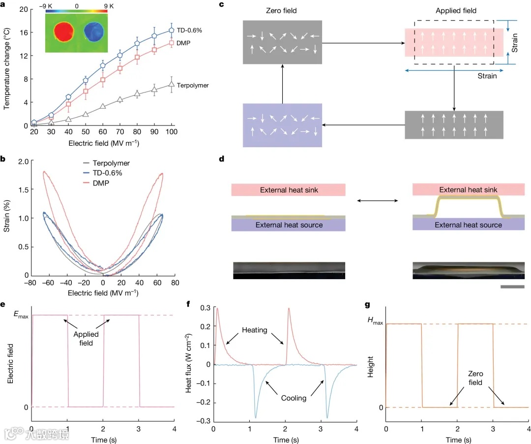 此前,钱小石教授课题组在2021年发表的Nature论文中已证实,通过高分子链内分子修饰的手段,可以大幅提升弛豫铁电高分子材料在低电场下的熵变性能。这类材料被称为双键调控高分子(Double-bond Modified Polymer,DMP)。本文中,研究人员通过进一步优化各项单体比例,使得目标高分子兼具高“电致熵变”与高“电致伸缩应变”的性能。在66.7 MV/m的电场下,DMP表现出9 K的绝热温变和1.9%的面内应变。得益于显著提升的机-电-热耦合性能,DMP薄膜无需额外的机械驱动力输入,在电场作用下同步产生足够大的空间位移和冷热变化,仅凭自身本征物理效应即组成了完整的热力学循环。