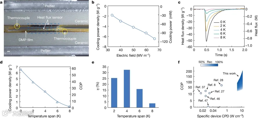巨电卡效应的电卡制冷技术因具有全固态、高能效、零温室效应潜能(GWP)及易于小型化、轻量化等理论优势,被国际能源署誉为制冷技术领域的颠覆性前瞻技术之一。在电卡制冷系统中,固态电卡材料(制冷工质)在电场的加载与卸载下实现间歇性的吸热与放热效果,并配合工质在空间位置的移动,实现与热源和热沉的交替接触,从而完成制冷循环。目前,绝大多数已报道的电卡制冷系统都依赖外置驱动设备(如机械泵、活塞、电机等),实现制冷工质的机械循环运动。这些设备往往需要分立的电源,体积、重量远大于实际系统中的电卡制冷工质。类似的设备一旦部署,如何体现电卡制冷技术在小型化、轻量化方面的优势始终是领域内的一项重要挑战。