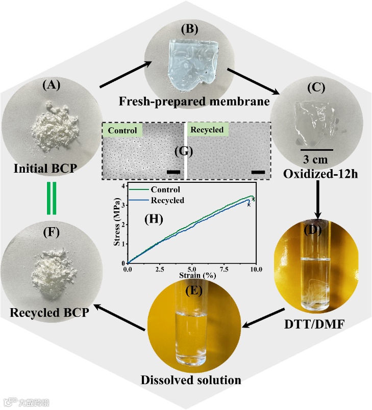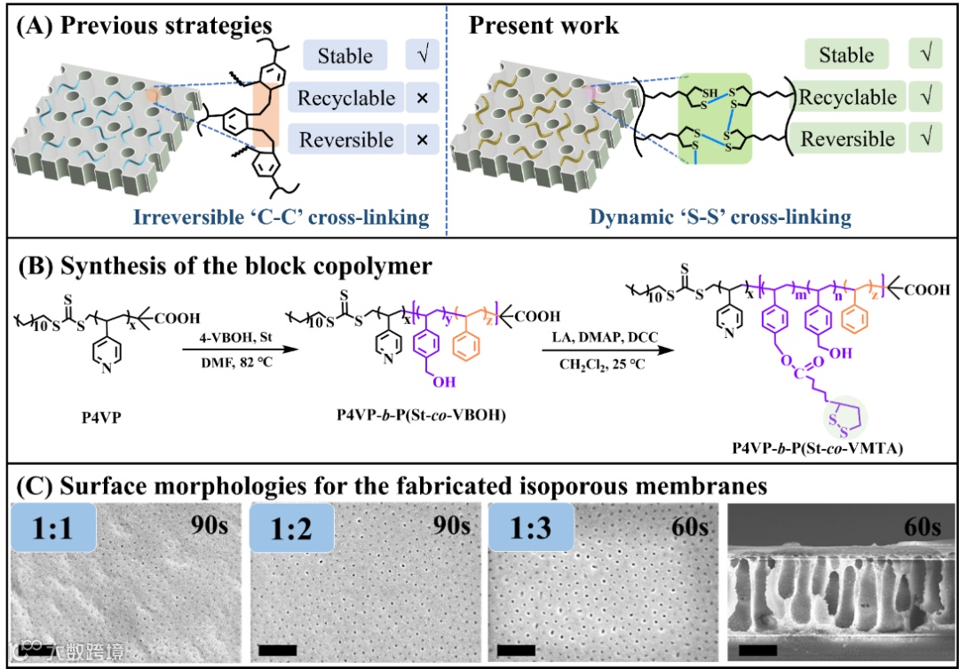 分子的精准、快速分离是构建下一代高性能分离膜的核心目标。具有均一孔径、窄孔径分布的均孔膜是实现两者高水平兼顾的理想膜材料。因其链段间较强的相排斥力和显著的pH智能响应性,PS-b-P4VP(PS4VP)被广泛应用于均孔膜的制备与分离应用研究。然而,作为典型聚电解质,成孔嵌段P4VP在强酸下容易发生剧烈溶胀,导致了均孔结构的不可逆破坏与变形,限制了PS4VP基嵌段共聚物均孔膜在长期运行中的稳定性、耐用性。同时,PS4VP基嵌段共聚物均孔膜耐溶剂性较差,难以应用于有机溶剂分离体系中。