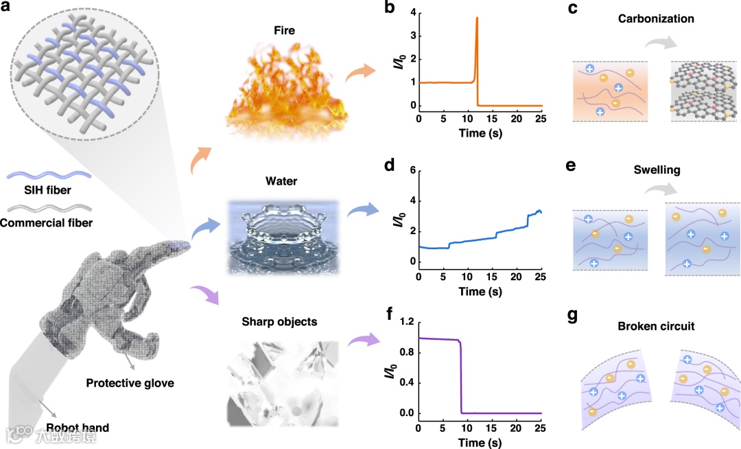 图 4:SIH纤维对火、水和锐利物的电学响应及其机理,展示了在识别危险方面的潜在应用。