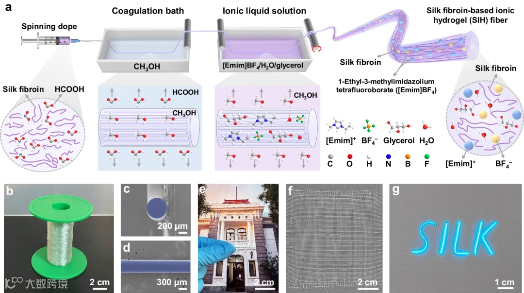 作者利用从蚕茧中提取的丝素蛋白制备了纺丝原液,并采用连续湿法纺丝方法制备再生蚕丝纤维。将该纤维通过含有离子液体([Emim]BF4)、甘油和水的溶液中以进行溶剂交换,制备了蚕丝基离子水凝胶(SIH)纤维。该纤维展现出良好的柔性、透明性和可编织性。并且基于良好的导电性,可以用作电致发光器件的柔性透明电极。