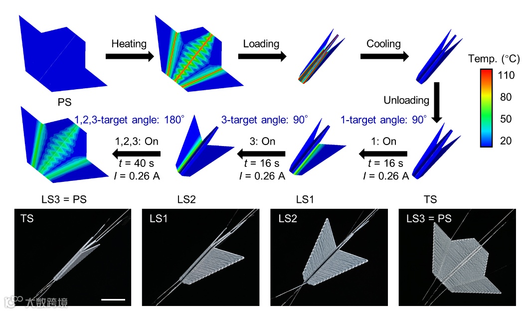 精确控制的电热折纸能够实现可重构。在多物理模拟的指导下采用不同的激励参数,可以精确控制电热折纸部署到多种构型,包括单层、双层结构和超材料单元构型(图3)。