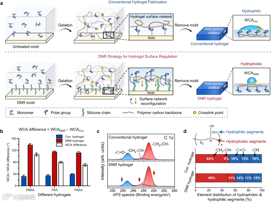 水凝胶是一种含水量极高的聚合物网络,具有广泛的应用前景,包括细胞培养、药物递送、组织修复和可穿戴电子器件等。尽管水凝胶的体相性质受到了广泛的研究关注,水凝胶的表界面特性对其发挥有效功能和实际应用也至关重要。基于单体/聚合物化学改性的化学策略和基于表面涂层技术、溶剂交换法和物理刺激调节等方法的非化学策略已被广泛探索用于水凝胶的表面性质管理。然而,这些策略通常会改变水凝胶整体或界面的化学组成和物理结构,并可能对其性能产生影响。因此,在不改变水凝胶整体化学成分的情况下有效且简便地调节水凝胶表面性质对于其多样化应用非常重要,但实现起来仍然具有挑战性。