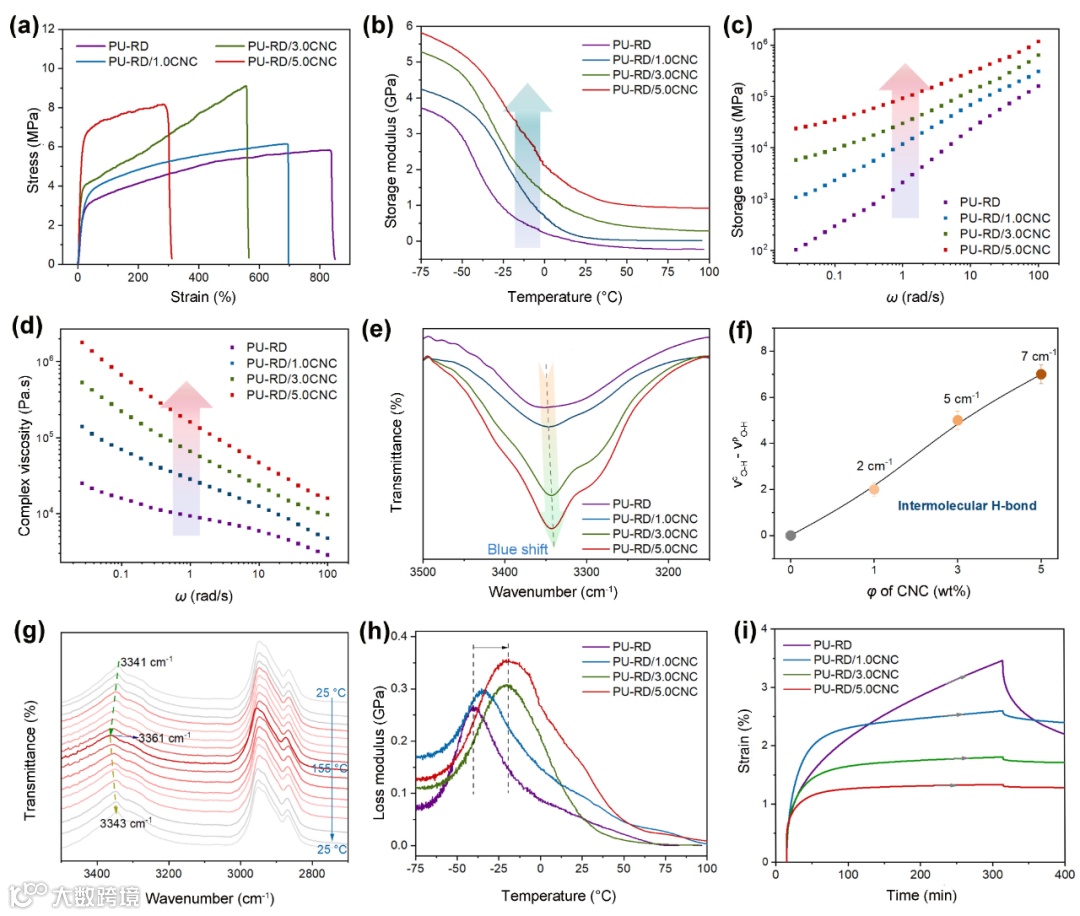 图2. PU-RD和PU-RD/CNC的力学性能. (a) 应力-应变曲线. (b) 储能模量随温度变化曲线. (c) 储能模量和(d) 粘度随频率变化曲线. (e) 波长在3500-3100cm-1的红外光谱图. (f) 羟基峰位移变化曲线. (g) PU-RD/5.0CNC的原位红外光谱图. (h) 损耗模量随温度变化曲线. (i) 蠕变曲线.