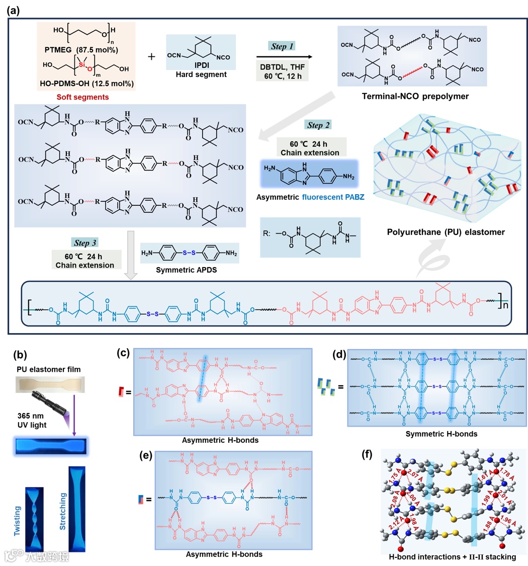 传统弹性体材料因具有出色的机械强度、尺寸和环境稳定性被广泛应用于军事、航空航天等领域。然而,尽管传统弹性体材料具有优异的机械和物理特性,但由于其缺乏内在的修复动力和响应能力,在服役过程中不能自监测和修复网络破坏,因此会不可避免地遭受机械和化学损伤。这些受损的弹性体材料在服役失效后被丢弃会导致严重的环境污染。因此,如何通过分子设计制备可自我报告损伤并修复的高强韧弹性体材料具有重要意义。
